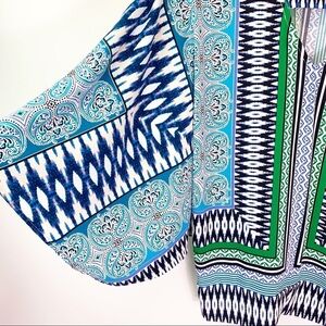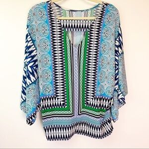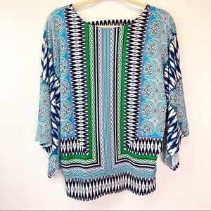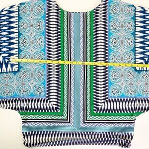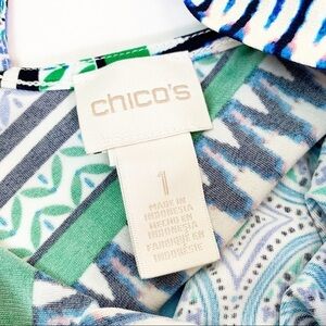 Chico’s colorful pull on top blue and green with black and purple. EUC. Back of top has cute V detail. No stains or holes. See photos for approx measurements. See Chico’s size chart pictured.