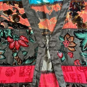 This pretty jacket has a distinct Asian styling like many of Chicos items one element is the frog closing at the front of the satin trim another is the more Asian characters on the red burnout velvet.