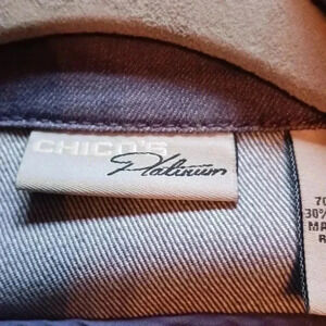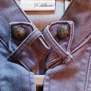 this is a Chico's Platinum denim jacket that has a stand-up collar with button trims and Ruffles approximately halfway down the front. it has princess seaming with some decorative tucks on the front and his two slit pockets on the front. it is a Periwinkle color. it measures 21 in from pit to pit and about 26 in Long from shoulder to hem. comes from a non-smoking no pet home. this is in excellent used condition.