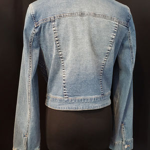 Chico's Platinum brand denim jacket with rhinestone studding, labeled size 0 which is S/4 in US Sizes, please visit Chico's website for their size chart
