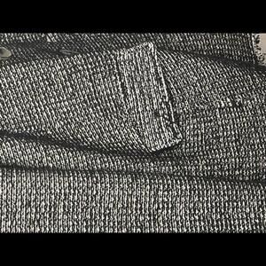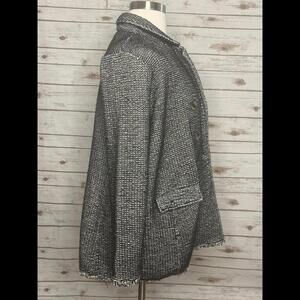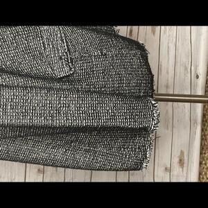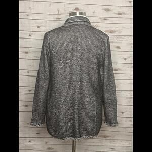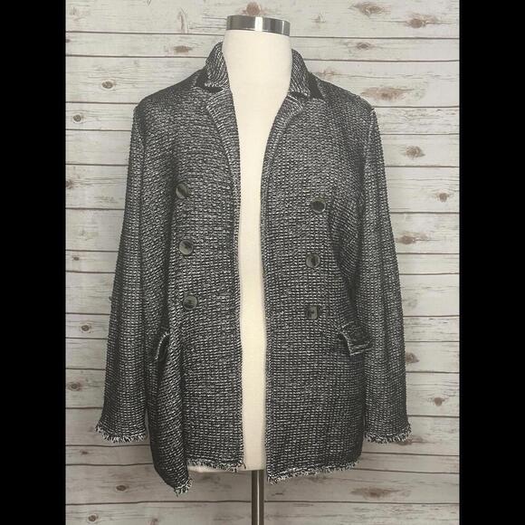 Black and white tweed pattern; notch collar; long sleeves; classic fit; front flap pockets; fringe detail along cuffs and hem