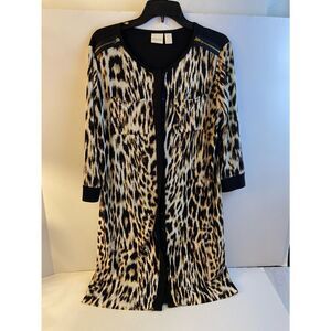 Chicos dress size 1. Black with animal print. Medium size 8. Measures 21” chest. 38” long. 96 polyester 4 spandex.