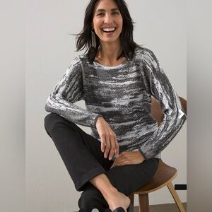 NWOT and no defects. Size 1=medium(last picture is a Chico’s sizing chart). Greys and white-1st 2 pictures is the best true color. Lots of pretty embellishments on top of sweater. Lightweight and cute. Armpit to armpit is 20” and center back length is 23 1/2”. Tote 15.