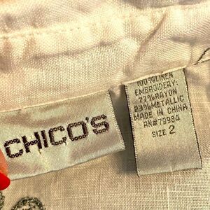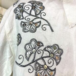 Chicos embroidered linen blouse w/ silver accent beading, silver thread, sparkle