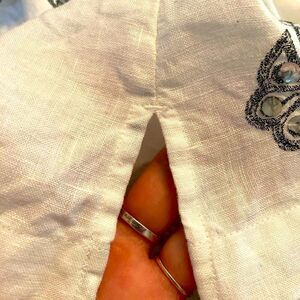 Really special boho western themed 100 💯 percent linen blouse with silver thread embroidery and beading. Buttons down w/ shell buttons. EUC. Armpit to armpit 22” and shoulder to hem 24”. Small side vents. Really special for occasions or everyday.