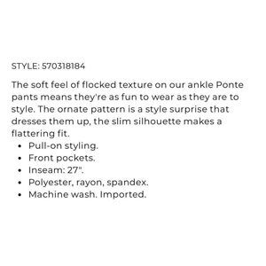 Chico’s flocked ponte pants pull on ankle 1.5 sz 10 new slimming tummy control