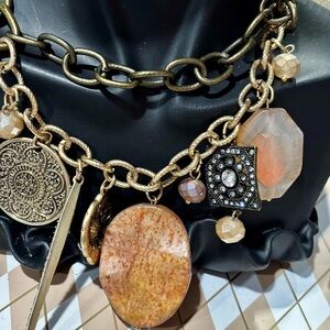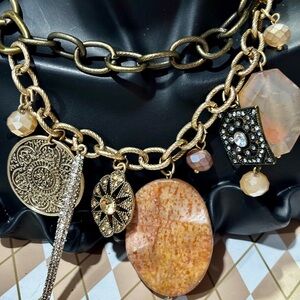 Elegant necklace featuring gold and orange pendants. Perfect for adding a touch of sophistication to any outfit.