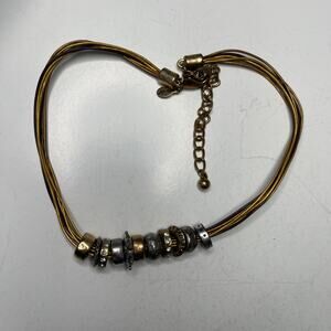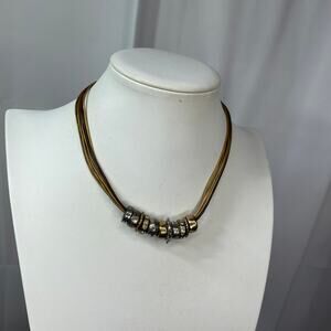 Chico’s Chicos necklace costume signed jewelry mixed metals beaded disks on gold tone and black cord in gold tone setting