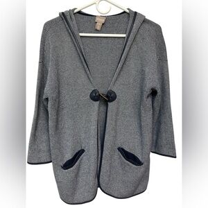 Chicos gray and navy hooded 3/4 sleeve jacket. Chicos size 1= medium. Faux leather toggle closure and accents. Cotton jacket. Great condition