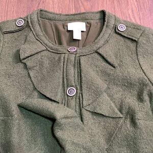 Chicos green wool blend ruffle jacket / lined sweater. Button up front with ruffle trim, thick and lined. No flaws found