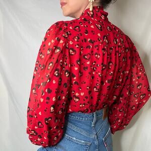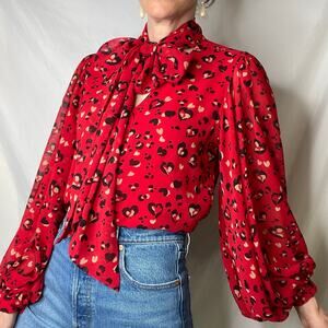 Chico’s heart animal leopard print blouse tie neck bow balloon sleeve red black. Voluminous long puff sleeves and tie neck bow detail. 100% polyester chiffon. Gently used preowned condition. Check out the video of this gem in its current condition!