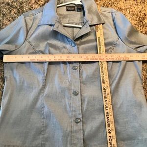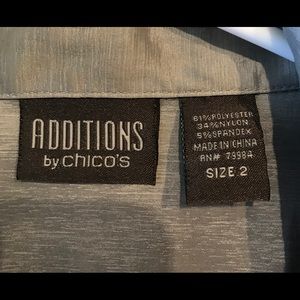 Chico’s lightweight and shimmery silver/grey dressy or casual jacket. Gently worn, in excellent condition. Size 2. Exact measurements as shown in photos.