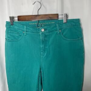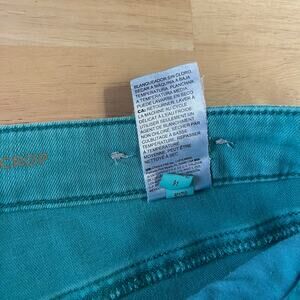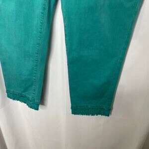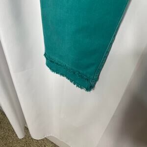 Chico's Chicos denim pants jeans vanity size 1.5 like size 10 (see Chico's sizing charts) the so Slimming Crop girlfriend in green teal with a raw edge hem