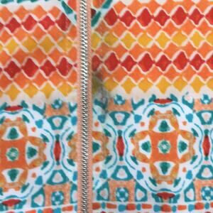 Chico’s kimono sleeve Mexican geometric print full zip lightweight jacket sz 0P; has a stain on the front near the zipper; SEE PICS