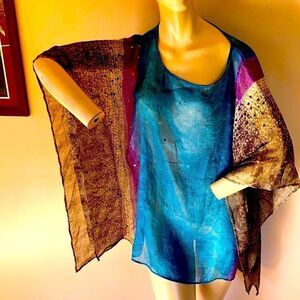 Chico’s one size Flawless blue purple and brown sheer sequin scarf weight kimono top