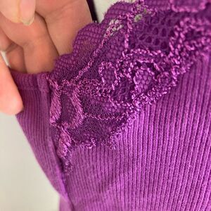 I love this but bought in wrong size! Perfect purple w/ gorgeous lace and stretchy satin straps that are fully adjustable. Like new no wear or flaws. Very stretchy cotton ribbed. Pit to pit before stretch 19” shoulder to hem as shown 23”. Wear alone or as layering piece. Make me an offer! Bundle for best prices!