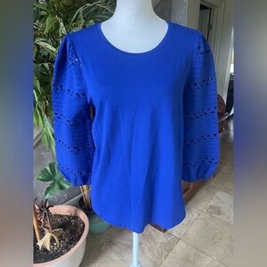 Chico’s ladies royal blue puff sleeve with lace trim blouse Chico size one US size medium NWOT cotton spandex blend 95% cotton super soft great summer Top