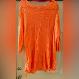 Women’s lightweight, long, knit sweater, 3/4 length sleeves. U/crewneck. Loosely knit. Lightweight. 2- pull ties at right and left hip. Very good, used condition. **this sweater has no tag. It’s my sweater and I have the exact same sweater listed in white, it’s a size 3 Chicos. If you’re unsure please refer to the measurements**