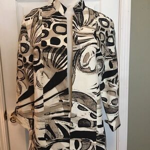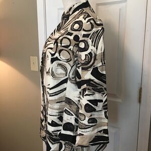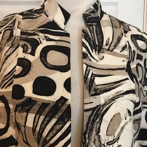 Chicos lightweight jacket size 1 or small. 56% silk and 44% linen. Hook and eye closure. Long sleeve with a turned up cuff. Short standup collar. Laid flat armpit to armpit measures 19 inches across and is 26 inches long. Work wear, office. professional. Excellent preowned condition.