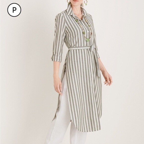 Our linen-blend maxi tunic takes summer style to great lengths in a breezy fabric that looks and feels like summertime. The maxi length creates a long, lengthening line, accentuated by the deep side slits. Wear this versatile tunic buttoned and belted as a shirt or as an open jacket over our matching striped linen-blend layering tank or a tee.