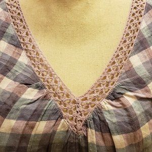 Chico's linen tunic in Blie, lilac and white with lilac needlepoint