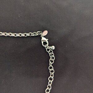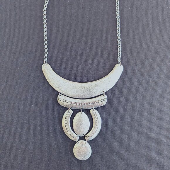 You won't find this very easily! (I know... I've looked.) Beautiful burnished metal necklace with curved metal pieces along with drop pendant-like pieces.