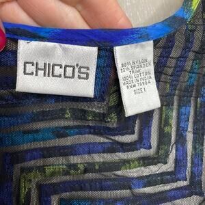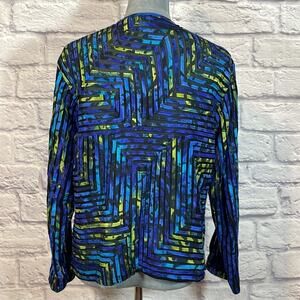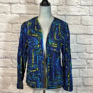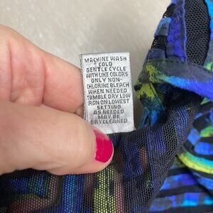 -Mesh fabric with strips of vibrant blues and greens woven throughout