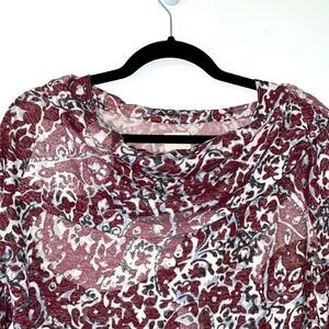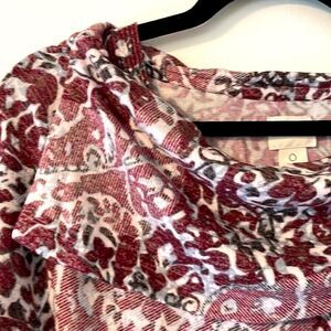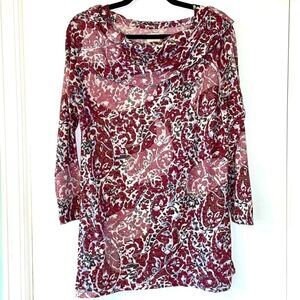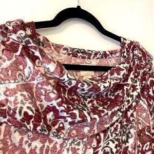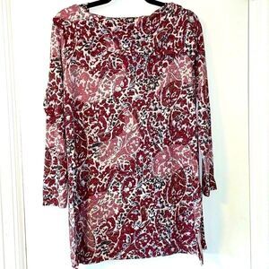 Chico’s modern asymmetrical soft cowl paisley print relaxed long sleeve tunic S. Super soft and comfy. Looks and feels fabulous on. Maroon and light maroon. This is a Chico’s size 0. About 20 inches from under one arm to the other. About 30 inches from shoulder seam to hem. Side vents for ease measure about inches. Has some stretch. Excellent used condition. EUC. Bundle with more items from my closet to save.