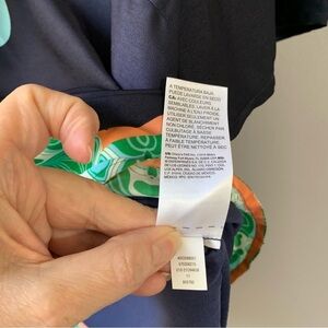 Chico’s navy with blue floral Hawaiian print with green geo trim sateen short sleeve blouse. Coastal grandma, beach, vacation, travel, summer, Hawaiian, floral. Size 3(16/18)L