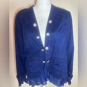 Navy blazer Chicos brand jacket with silver buttons and ruffled bottom. Very cute, great condition. Chicos size 1