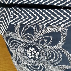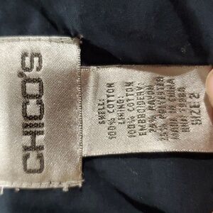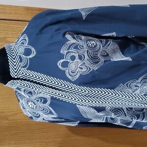new with tags no issues size 2 chicos size large US navy blue with white embroidered floral pattern mock collar hook closures retailed for 98.00 by chicos