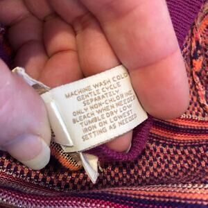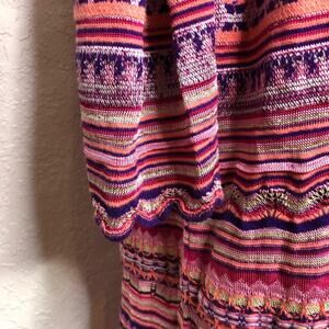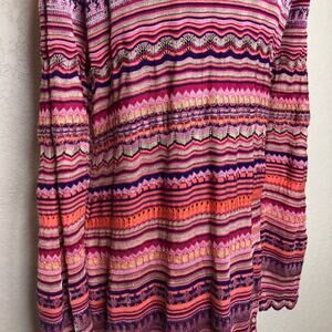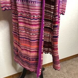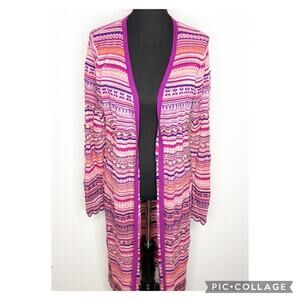 Chicos pink purple orange metallic striped chevron crochet knit open front long cardigan. Full open front. Long duster length. Scalloped hemline and sleeve cuffs. Size 2 or Medium. Good preowned condition. One snag on bottom front hemline.
