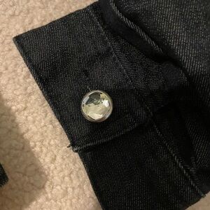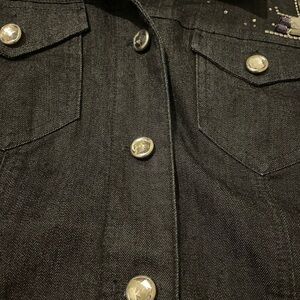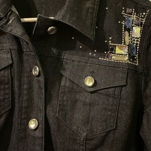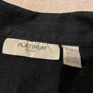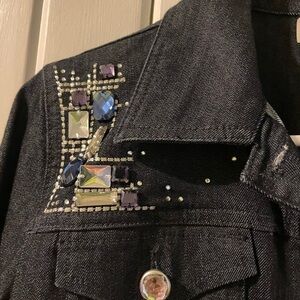 Like new-worn once. Size 1 which = medium (8) US. Chico’s platinum very dark denim with lots of rhinestone bling. Very cute and fun jacket. Armpit to armpit 20 1/2” and centerback length is 20 1/2”. Tote 16.