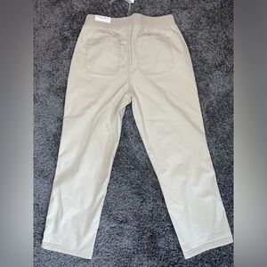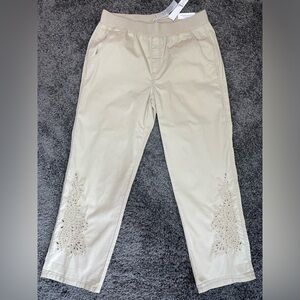 Chico’s pull on, embroidered, eyelet hem, tan khaki colored, lightweight, some stretch, cotton blend, crop capri pants. Chico’s size 0.5 Women’s size 6