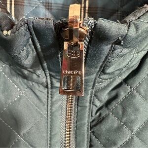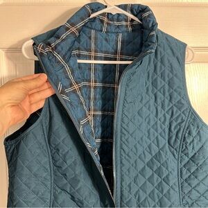 Chico's reversible quilted vest in Deepest Teal/Plaid. Pockets on both sides, 2 way zipper.