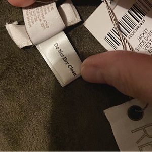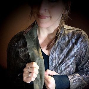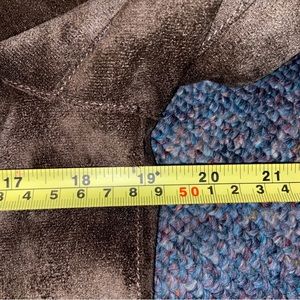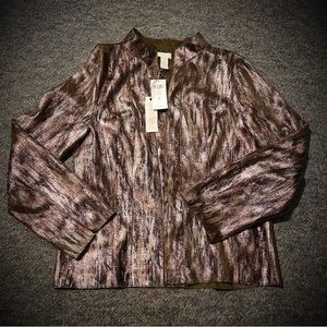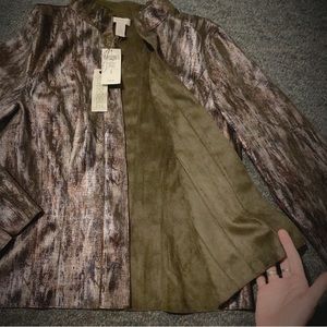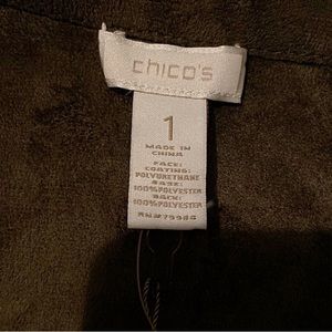 ‘Chico’s’ brand reversible suede jacket. Size 1 (which is equal to a size 8). Brand new with tags ($199.00). Very nice muted natural colors on one side with a sheen (adds brightness), and a ‘muddy’ brown suede on the other side. The tag on the brown side can be removed if worn with the brown side out. There is a slit in each cuff (and no slits on bottom of the jacket). No buttons or snaps, and no pockets. It measures about 19 in. from armpit to armpit, 23 in. from top of shoulder to bottom, and a sleeve length of 16 1/2 in. from armpit to cuff. The material is as follows: The face coating is polyurethane. The base is 100% polyester, and the back is 100% polyester. Very sharp!🤎