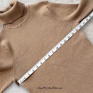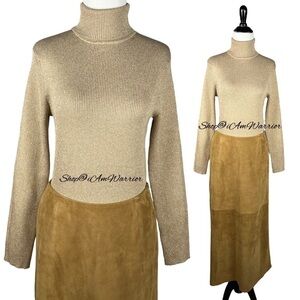 Chicoโs ribbed turtleneck sweater in a gorgeous gold metallic stretch fabric that is the perfect way to add shimmer to any outfit! Perfect layering piece under a blazer too. EUC. Size 1 in Chicoโs equates to a ladies size medium. Fits s/m. See photos for measurements keeping in mind that this has lots of stretch! Shown here with my Brooks Brothers suede skirt (sold separately).