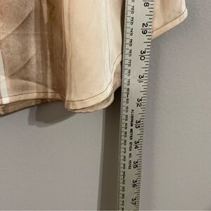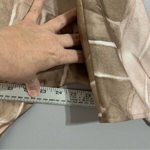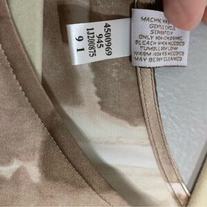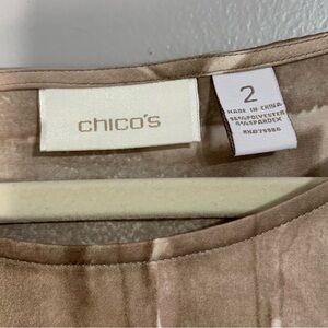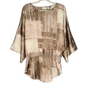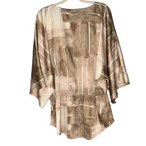 Chico’s poly satin tan, cream, blush pink and brown abstract print with blousy smocked waist and batwing sleeve. Classic, dressy, evening, contemporary, stylish. Size Chico’s 2(L)12