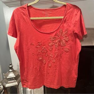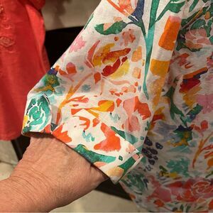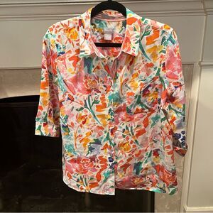 Both tops are Chico’s brand size 2. The floral is petite but measures regular.