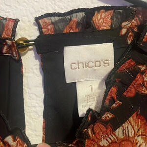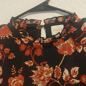 Preowned nice condition Chicos size 1 (Medium) bell sleeve fall colored top. Black with golden brown floral print. Sheer blouse with black lining. Sleeves remain sheer as lining does not cover arms.
