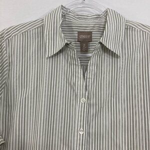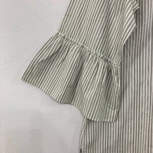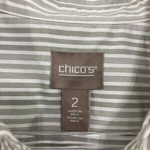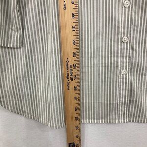 Chico's size Large/2 Gray White Striped Ruffle Sleeve Preppy Button Down Office