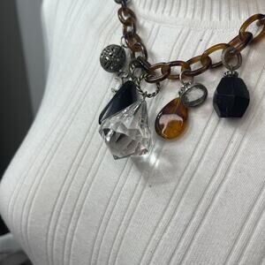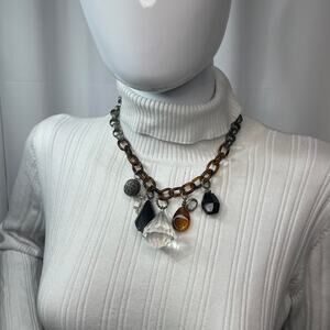 Chico’s Chicos necklace costume signed jewelry burnished silver tone with tortoise shell resin chain link and large crystal charm with various other charms, bohemian boho 15” in length with a 3.5” extension.