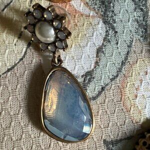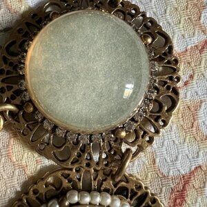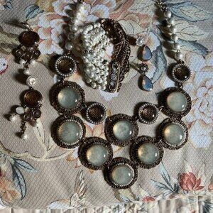 Gorgeous and unusual Chico's statement necklace set that includes a matching stretch bracelet and 2 pairs of earrings. The necklace measures appropriately 15 inches with 4 inches of extra links. The necklace is faux opal with two sizes of medallions. The smaller medallions have a bronze/gold finish and pattern and are surrounded by faux pearls, and the larger medallions have a bronze/gold outer finish and faux opal pattern which resembles leopard and the medallions for the faux opal/leopard print are surrounded by rhinestones. The necklace has faux pearls that are attached to the medallions.