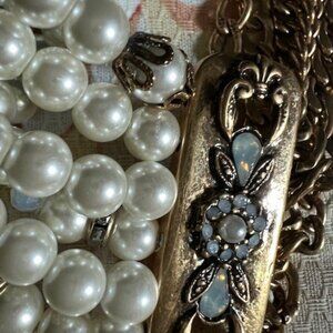 The bracelet is a stretch bracelet with 6 rows of faux pearls interspersed with rhinestones and embellishments on some of the faux pearls - this is one half of the bracelet. The other half of the bracelet there are 6 rows bronze/gold chain links of various patterns. Separating the pearls/links are two gold/bronze bars with inlaid faux opal.