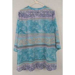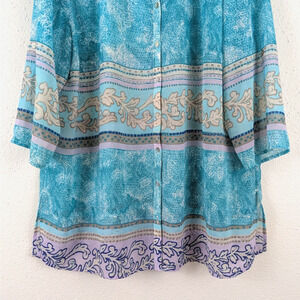 size 3, sheer, tunic shirt, buttons up the front, not lined, see through material, 3/4 sleeves, lighter in color than pictures, slits on sides