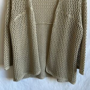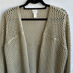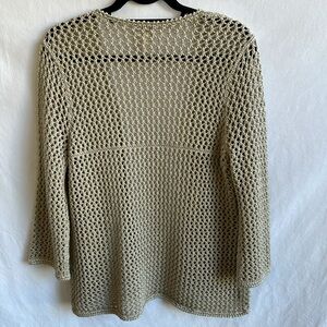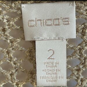 Chico’s tan open front sweater with interwoven gold metallic thread, size 2/M