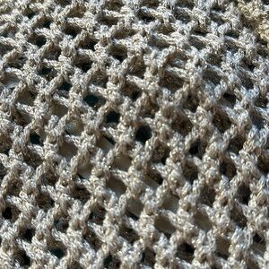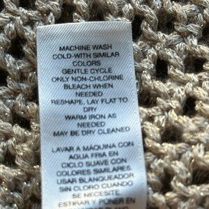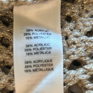 Chico’s tan open front sweater with interwoven gold metallic thread. Chico’s size 2; size M/L elsewhere; see dimensions below. Good preowned condition.