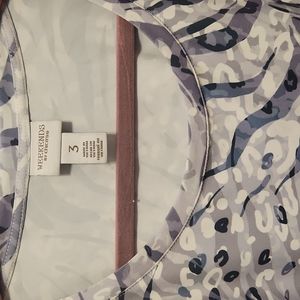 Weekends by Chico's summer tee, polyester/spandex, cap sleeves, white with green, blue and grey designs, size 3.