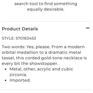Elegant necklace with a gold tassel and tan braided cord. Features a medallion and tassel like accent.