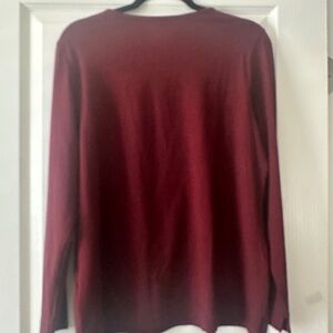 This classic layering tee is very soft. Long sleeves and a scoop neck make it ideal for layering or wearing alone. The fabric is 48% cotton, 45% modal, and 10% spandex. The color is a gorgeous cranberry spice. P2P 21", length 26".